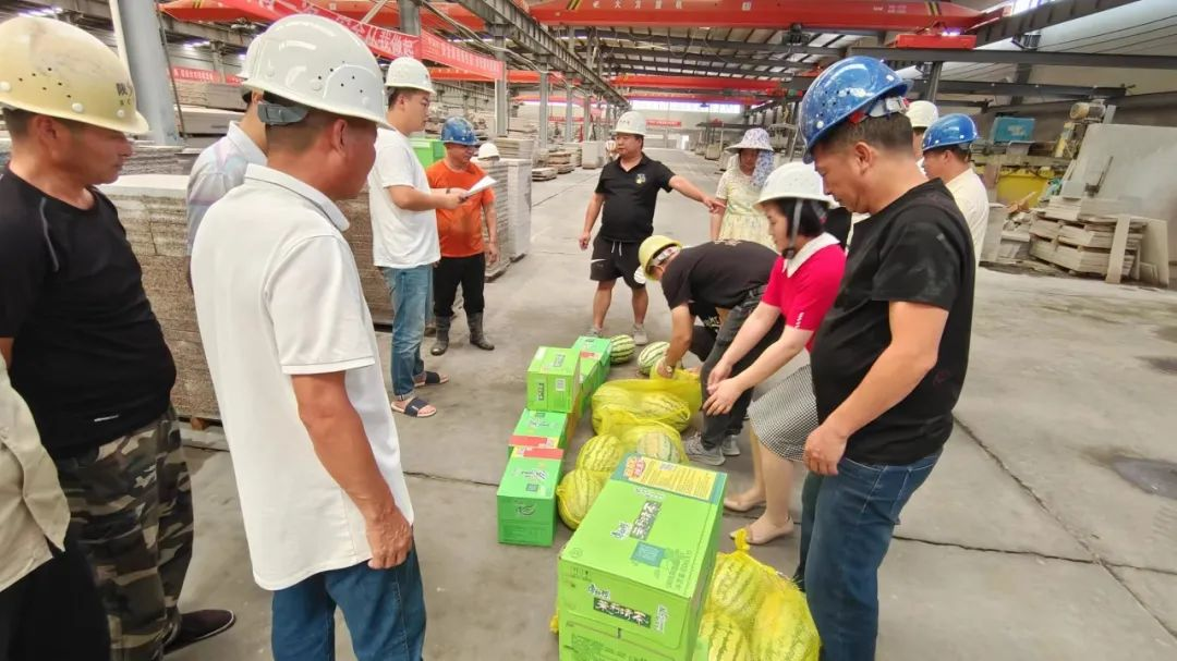 近日,陕建内蒙矿业公司副总经理窦春华、总经理助理甄景辉带着矿业公司党政工的关心,到生产车间一线现场,为员工送去西瓜、水及浴巾(毛巾)等防暑降温用品。