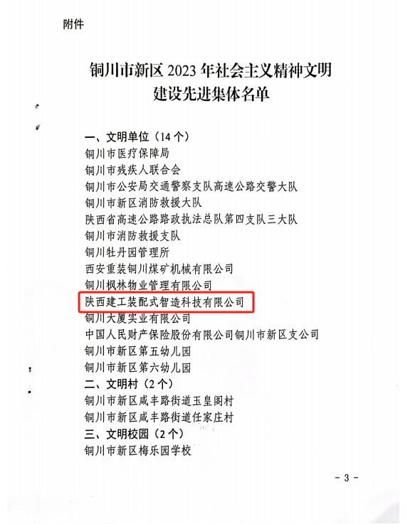 近日,铜川新区党工委、管委会联合发文,公布了铜川新区2023年度社会主义精神文明建设先进集体,陕建装配智造公司榜上有名,成功创建为铜川市区级“文明单位”。