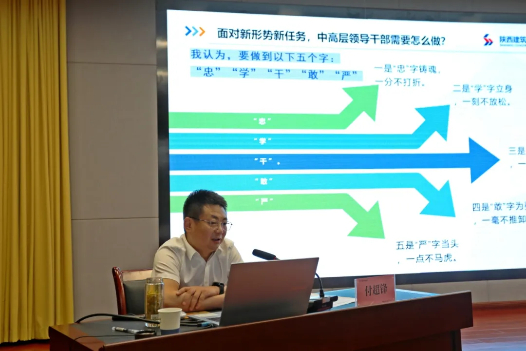 集团党委书记、董事长付超锋在“同心勠力 担当作为,做促进企业改革发展的中流砥柱”专题党课中强调,党员干部要要严于律己、以身作则,做到“学”字立身,一刻不放松、“干”字在先,一丝不懈怠、“严”字当头,一点不马虎,要学知识、练本领、知敬畏、顾大局,奋力谱写集团全面高质量发展的崭新篇章。