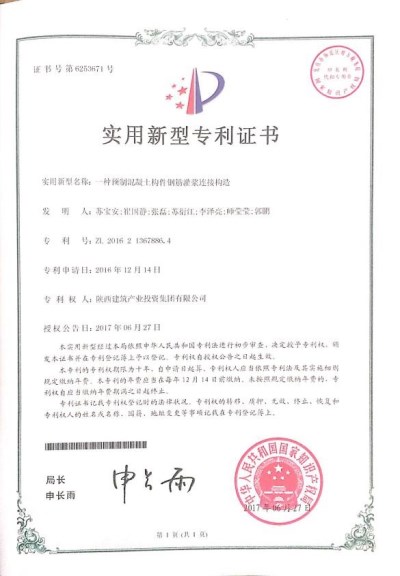 近日,由集团公司申请的实用新型专利《一种预制混凝土构件钢筋灌浆连接构造》,经中华人民共和国国家知识产权局严格审查,已顺利通过并喜获授权。